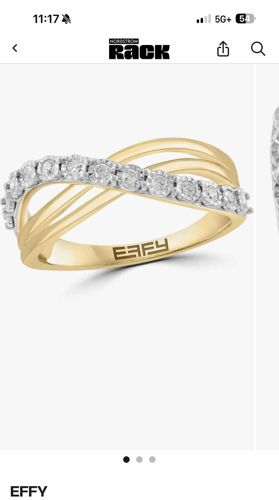 This is a contemporary fine jewelry ring featuring a crossover or 'X' design, characterized by three interlacing bands. One primary band is prominently set with a row of round brilliant-cut white diamonds, while the remaining two bands are polished 14K yellow gold. The diamonds are housed in white gold or rhodium-plated settings to enhance their brilliance and create a seamless appearance. The inner shank of the ring clearly displays the 'EFFY' brand logo hallmark in a bold, block-style typeface, indicating its origin from the luxury designer Effy Hematian. The construction shows high-quality craftsmanship with a smooth High-polish finish and secure prong settings for the stones. The piece displays a modern, fluid aesthetic that balances the warmth of the yellow gold with the bright sparkle of the pavé-set gemstones. As a retail stock image, the item appears in mint condition with no visible wear, scratches, or missing stones. The bypass style creates a tiered, dimensional look on the finger, typical of mid-to-high-end jewelry found in department stores like Nordstrom Rack.