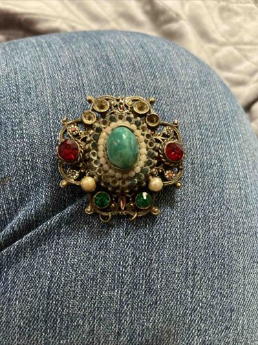 This is a vintage, highly ornate costume brooch designed in the Renaissance Revival or Austro-Hungarian style. The piece features a central oval-shaped green cabochon, likely glass or lucite imitating turquoise or jade, surrounded by a double halo of small white seed beads and green rhinestones. The structural setting is crafted from an aged gold-tone or brass-colored base metal with intricate wirework filigree and granulation details. It is further embellished with faceted red and green glass rhinestones arranged symmetrically around the center. Two small cream-colored faux pearls are visible at the lower quadrants. The overall construction is tiered, giving the piece a three-dimensional, architectural appearance. Regarding condition, there is notable aged patina and oxidation to the metal surfaces, which is common for pieces of this era (likely mid-20th century). Several small clear rhinestones appear to be missing from the circular bezel settings at the top, leaving empty 'cups.' There are no immediately visible maker's marks or signatures on the front, though the craftsmanship reflects mid-century costume jewelry trends that prioritized elaborate, heavy aesthetics. The item shows signs of wear consistent with age, including slight surface scuffing on the central cabochon.