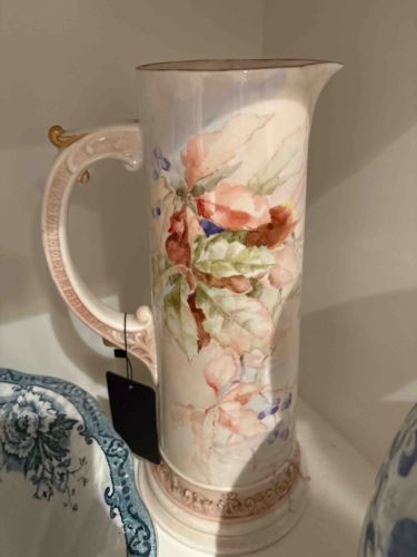 This is a tall, cylindrical porcelain pitcher, commonly referred to as a cider or beverage pitcher, featuring a highly iridescent mother-of-pearl lustre glaze finish. The central body is hand-decorated with a large, impressionistic floral motif in shades of peach, rose, and sage green, accented by small blue berries or floral buds. The vessel features an ornate, C-scroll handle with moulded relief details highlighted in gold gilt, which is also present along the rim. The base of the pitcher is flared and features a band of moulded relief ornamentation in a blush pink tone. Physically, the piece appears to be made of fine porcelain or bone china, standing approximately 10 to 12 inches tall. Regarding condition, the piece shows some minor rubbing to the gilt at the rim and handle, consistent with age, but no immediate structural cracks or large chips are visible. The style is typical of late Victorian or Edwardian eras (circa 1890-1915), likely produced by a high-quality manufacturer such as RS Prussia, Haviland, or a similar European factory specializing in floral chinaware. The craftsmanship is evident in the delicate application of the lustre and the intricate moulding of the handle and base.
