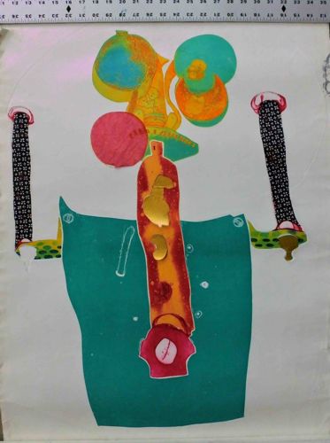 This is an original mixed media collage on ivory-toned heavy-gauge paper, measuring approximately 24.8" x 33.3". The artwork presents an abstract, anthropomorphic figure composed of various cut-out elements. The central 'torso' is a teal-green block, accented by a vertical orange and red element with gold foil-like inclusions. Two arm-like structures extend outward, featuring black fabric with a repeating white floral or geometric pattern. The head area is a complex arrangement of overlapping organic shapes in shades of yellow, cyan, and magenta, some of which appear to be printed or hand-painted with a textured, mottled finish. The piece shows signs of contemporary craftsmanship, utilizing collage, printmaking, and possibly hand-tinting. Notable condition details include light horizontal rippling across the paper surface (cockling), consistent with paper-based media, and minor edge wear. There are faint pencil guide marks visible beneath some of the shapes, indicating a planned compositional layout. The work lacks a visible signature on the face but reflects an experimental, postmodern style likely dating from the late 20th to early 21st century. The use of gold leaf or metallic paper adds a reflective quality that contrasts with the matte teal and vibrant primary colors of the other components.