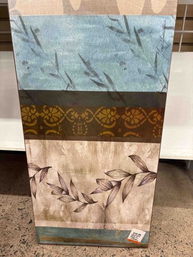 This is a rectangular decorative wall art piece, likely a giclée or mechanical print on canvas, stretched over a wooden frame. The composition is divided into horizontal bands featuring a mix of botanical and ornamental patterns. The top section shows a light beige texture, followed by a wide band of sky blue with faint, dark leaf silhouettes. A signature is visible in the upper right quadrant of this blue section. Below this is a dark, near-black horizontal line separating a rich brown band decorated with gold-toned damask or fleur-de-lis motifs. The bottom half is dominated by a light cream and tan mottled background featuring a more defined branch of dark, brownish-purple leaves. The craftsmanship appears to be commercial grade, designed for contemporary home decor. Condition-wise, the piece appears to be in fair to good condition, although it currently bears a white and orange retail price tag ($10.99) on the bottom right corner, suggesting it is a secondary market find. There are no obvious tears in the canvas, though slight scuffing may be present at the edges. The style is typical of mass-market interior design floral art from the early 2000s.