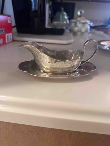 This item is a sterling silver sauce boat (or gravy boat) featuring a classic low-profile body with a scalloped rim and a traditional C-scroll handle. It rests upon an integrated or formerly attached oval underplate, also designed with a matching scalloped or lobed edge. The piece is constructed from high-quality sterling silver, characterized by its lustrous, bright metallic finish which currently exhibits significant atmospheric tarnish and surface patination consistent with age. Notable features include fine chased or engraved floral and foliate scrolling across the exterior body of the vessel, suggesting Mid-Century or late 19th-century styling. Regarding condition, the sauce boat appears significantly worn with visible surface scratches and darkened oxidation throughout. Critically, the body of the boat has come detached from its structural base/underplate, which represents serious damage to the structural integrity of the set. The craftsmanship displays thin-gauge silver work often associated with manufacturers such as Gorham, Reed & Barton, or Wallace. Given its decorative elements and form, it likely dates from the 1930s to the 1950s. The detached base suggests a failure at the solder point, requiring professional restoration to return it to functional condition.