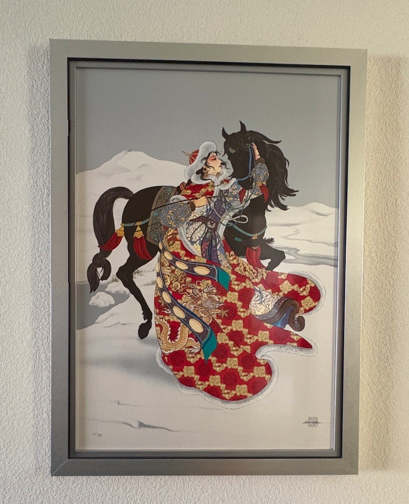This is a large-format limited edition serigraph (silkscreen print) by the renowned Art Deco artist Romain de Tirtoff, widely known as Erté (1892–1990). The artwork depicts a stylized female figure in elaborate, faux-fur-trimmed regal winter attire, cradling the head of a dark horse amidst a snowy, mountainous landscape. The composition is characteristic of Erté’s late-period graphic work, executed with remarkable precision and opulent color. The central figure wears a flowing red robe adorned with intricate gold dragon motifs and geometric patterns, displaying the artist's background in fashion design and theatrical costuming. The color palette is sophisticated, utilizing high-contrast blacks, deep reds, and metallic golds against a minimalist gray and white background. Looking at the bottom margin, there are two distinct markings: on the bottom left, the pencil-written numbering '117 / 300' indicates this is a limited run print, which significantly adds to its collectibility. On the bottom right, Erte’s stylized signature is visible alongside a chop mark or embossed seal often used by Sevenarts Ltd or Chalk & Vermilion, his primary publishers. The print is professionally housed in a contemporary silver-toned metal frame with a deep profile, providing a clean, modern aesthetic that contrasts with the ornate details of the print. The condition appears excellent with no visible fading, foxing, or moisture damage to the paper. The registration of colors is sharp, a hallmark of high-quality serigraphy where multiple layers of ink are applied to create a tactile, saturated surface. This piece likely dates from the 1980s, a period when Erté experienced a major career revival and produced his most popular graphic editions.