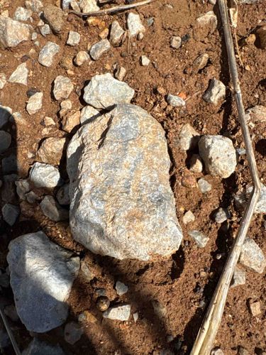 This item is a medium-sized, irregularly shaped cobble found in a terrestrial, soil-heavy environment. Physically, the specimen measures approximately 10-15 centimeters in its longest dimension and appears to be composed of a coarse-grained igneous rock, likely granite or a related leucocratic silicate material. Its color palette is dominated by mottled grays and whites, with significant iron-oxide staining across the surface, resulting in brownish-orange patches. The construction is entirely natural, featuring a rough, non-uniform texture with visible crystalline structures. Notable features include sharp, angular edges suggesting it has not undergone extensive fluvial erosion or 'rounding.' There are no man-made markings, signatures, or stamps, as this is a natural geological object. The condition reflects its 'as-found' state, covered in loose reddish-brown soil and dust, with no signs of human modification or artistic rendering. This is a geological specimen of indeterminate age, likely formed millions of years ago through volcanic cooling but recently weathered into its current clastic form. The craftsmanship is nonexistent, as it is a product of natural geological processes rather than human manufacture.