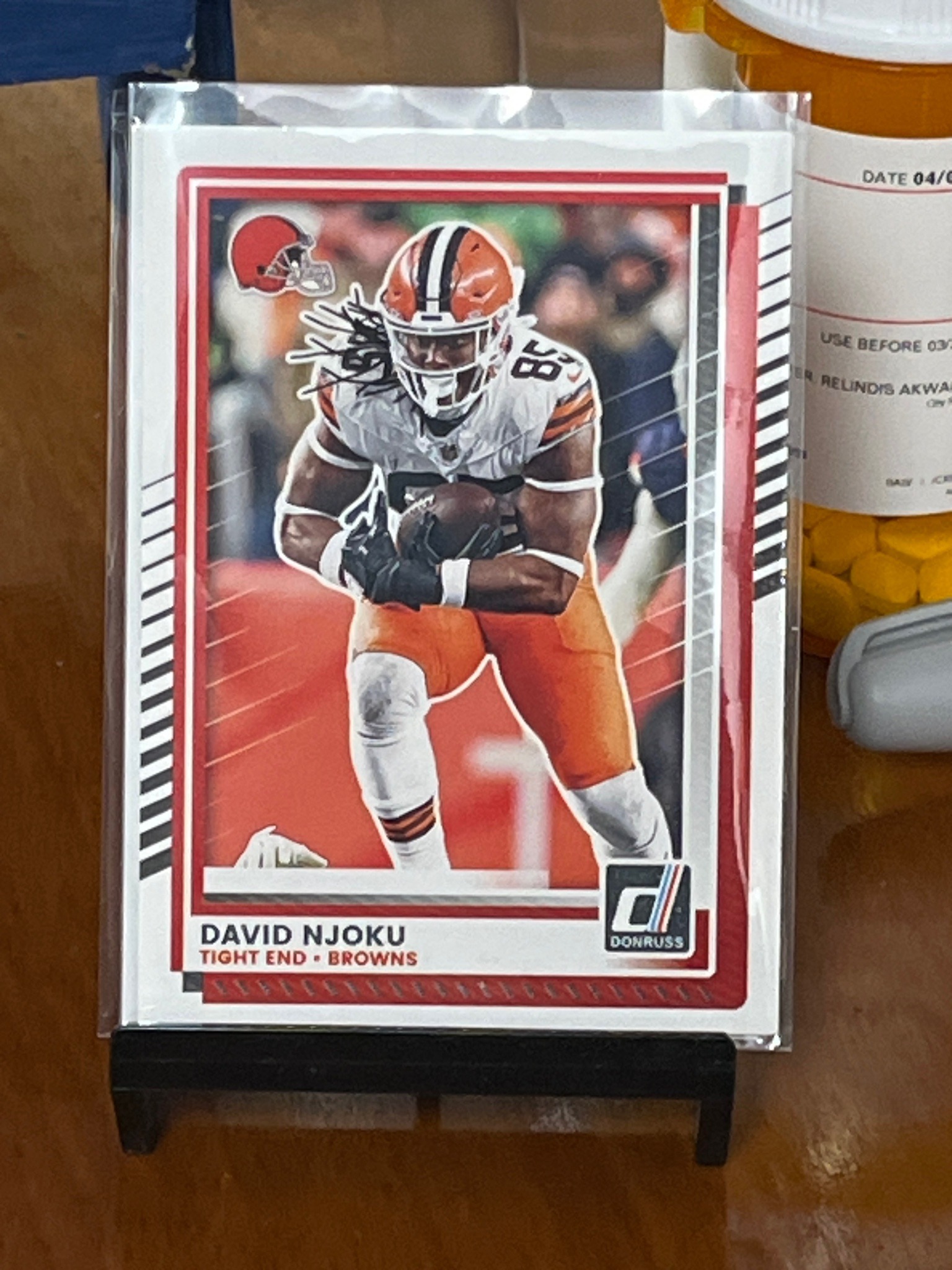 This is a standard 2.5 x 3.5-inch trading card featuring David Njoku, the Tight End for the Cleveland Browns. The card is from the 2023 Donruss Football set, produced by Panini America. The card layout features a high-action photography shot of Njoku in his home Browns uniform, carrying the football. The design includes a white primary border with an inner red boundary. The bottom right features the iconic 'Rated Rookie' style 'D' Donruss logo. The player's name and position are clearly printed in the bottom left corner in a sans-serif font. The graphics include stylized diagonal line patterns on the left and right sides of the inner frame, characteristic of the 2023 Donruss design language. The card is currently housed in a clear protective 'penny sleeve' to prevent surface scratches. Based on the visual evidence, the card appears to be in 'Near Mint to Mint' condition; the corners look sharp through the plastic, and the centering seems relatively balanced, though the left border appears slightly thicker than the right. There are no visible creases, stains, or surface indentations on the front face. The card uses basic cardstock construction with a gloss finish, typical of a modern base-set sports card from the early 2020s.