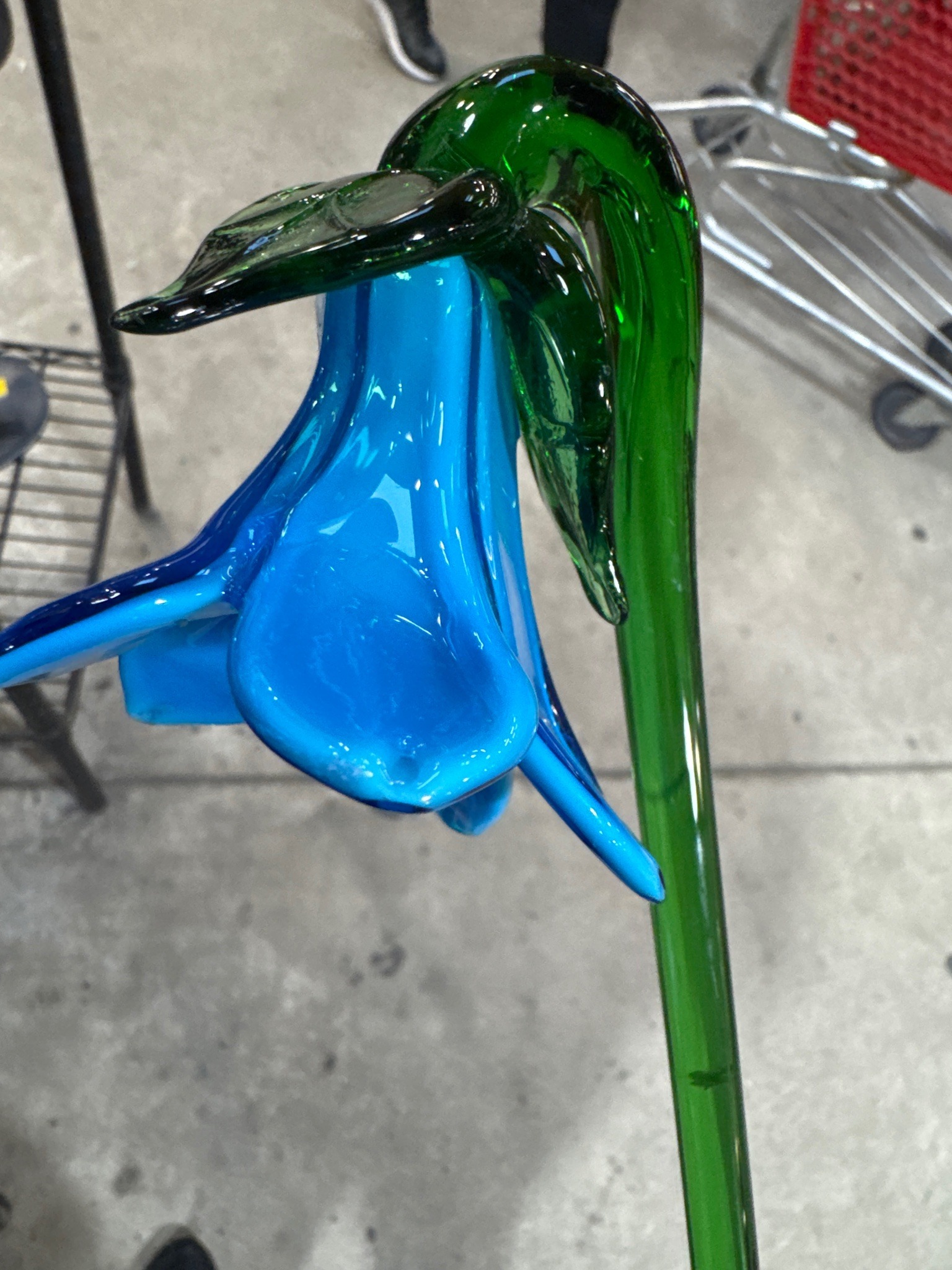 This item is a decorative hand-blown glass flower, specifically designed to resemble a bluebell or bellflower. The piece features a vibrant, opaque azure-blue corolla with flared, pointed petals and a deeper blue accent along the rim. It is attached to a solid, translucent emerald-green glass stem that curves gracefully at the apex. A matching green leaf is fused to the top of the curve. The construction exhibits classic lampworking or glass-blowing techniques, visible in the fluid transitions between the flower head and the stem. Physically, the glass has a high-gloss finish with several interior air bubbles (seeds), which are characteristic of artisanal glass rather than mass-produced factory pieces. There are no visible maker's marks, signatures, or pontil scars in the current view. The condition appears fair to good; however, there is noticeable scuffing and white residue at the very tip of the lower blue petal, likely indicating surface wear or impact damage. The style is contemporary, probably late 20th or early 21st century, often found in studio art glass or high-end giftware. The item’s charm lies in its organic, flowing lines and the bold contrast between the cool blue and warm green tones.