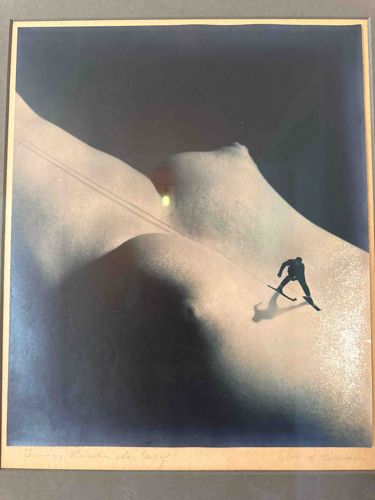 This item is a vintage surrealist art print that cleverly juxtaposes human anatomy with a winter landscape. The central image features a nude female torso, seen from an angled, low perspective where the breasts and hips are stylized to resemble snow-covered mountain peaks. A small figure of a skier is superimposed onto the lower right breast, trailing lines like ski tracks across the skin. The color palette is dominated by soft blues, deep grays, and the warm flesh tones of the subject, which take on a luminescent quality against the dark background. The lighting is focused, casting soft shadows that emphasize the organic curves and mimic the undulations of a mountain range. The print appears to be on paper with a noticeable grain or texture, exhibiting a yellowed patina along the bottom border consistent with age. Handwritten inscriptions are visible in pencil on the bottom margin: the title "Twin Peaks de Cali" is on the left, and a signature that appears to read "Elward of California" is on the right. The work is likely from the mid-20th century, approximately the 1950s or 60s, reflecting the humorous erotic-surrealist style of that era. Condition issues include slight yellowing and potential minor foxing near the edges, though it is currently protected within a mat.