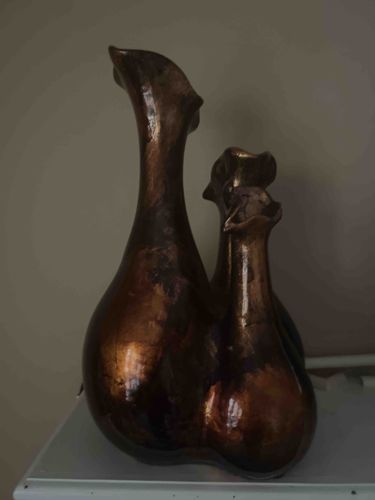 This decorative ceramic vessel features a distinctive Mid-Century Modern biomorphic design, characterized by three interconnected bulbous chambers that taper into elongated, organic necks. Each neck terminates in a uniquely shaped, flared rim reminiscent of calla lilies or stylized pitcher plants. The piece is finished in a high-gloss metallic bronze or copper glaze, exhibiting a rich, variegated patina with deep amber and obsidian undertones that shift under light. The construction suggests a hand-molded or heavily altered slip-cast technique, resulting in fluid, asymmetrical silhouettes. Standing approximately 10 to 14 inches tall, the surface displays fine crazing consistent with age and intentional atmospheric firing. While no maker's marks are immediately visible in the current view, the aesthetic aligns with late 1960s to 1970s studio pottery or high-end mass-market decor from firms such as Haeger or McCoy. The condition appears stable with minor surface abrasions and dust accumulation; there are no catastrophic cracks or chips evident on the primary faces. The sculptural quality and high-reflectivity glaze indicate artisanal craftsmanship designed to serve as a bold interior focal point.