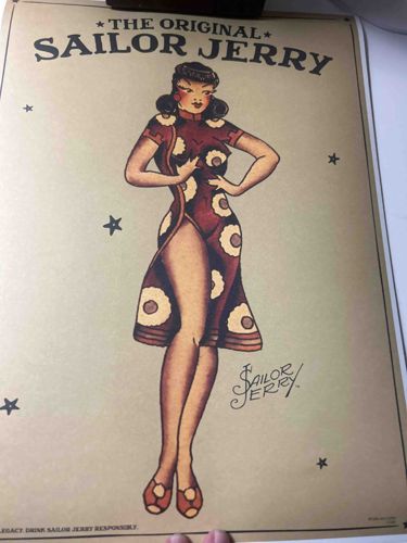 This is a contemporary promotional poster featuring the iconic 'Hula Girl' tattoo flash art by Norman 'Sailor Jerry' Collins. The artwork depicts a pin-up style woman in a high-slit red dress with white floral patterns, set against a tan or parchment-colored background. The text at the top reads '*THE ORIGINAL* SAILOR JERRY' in a bold, vintage-style serif font, accompanied by a stylized 'Sailor Jerry' signature in the lower right area. The poster is framed by several small black nautical stars. Measuring approximately 18 by 24 inches, the piece is printed on what appears to be a medium-weight semi-gloss paper stock. Notable condition notes include slight curling at the edges, consistent with being stored in a tube, and a small pinhole or staple mark in the upper right corner. At the very bottom left, fine print reads 'DRINK SAILOR JERRY RESPONSIBLY,' identifying this as a piece of marketing merchandise for the Sailor Jerry Spiced Rum brand rather than an original vintage tattoo flash sheet. The craftsmanship reflects modern digital printing techniques, maintaining the bold black outlines and simplified color palette characteristic of mid-20th-century traditional Americana tattooing.
