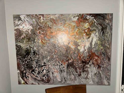 This item is a large-format abstract expressionist artwork created using a fluid acrylic pour technique on a stretched canvas. The piece exhibits a complex marbling effect with a palette dominated by earthy and metallic tones, including burnt sienna, deep ochre, charcoal grey, and iridescent copper or gold accents. The composition centers around a bright, circular focal point toward the upper-middle section, reminiscent of a sun or celestial body, around which the paint flows in chaotic, organic swirls. The technique involves thin layers of acrylic pigment mixed with pouring mediums to create 'cells' and lacing, particularly visible in the lower sections where white and black pigments interact. The canvas appears to be a gallery-wrapped style, though it is currently unframed and mounted directly to a light grey wall. The dimensions appear to be approximately 30 by 40 inches. No visible signature is discernible from the front, which is common for contemporary pour art. The condition is excellent with no visible cracking (crazing), fading, or surface damage. The craftsmanship is characterized by the deliberate control over fluid dynamics, resulting in a dense, multi-layered texture that suggests a modern creation, likely from the late 2010s to the early 2020s.
