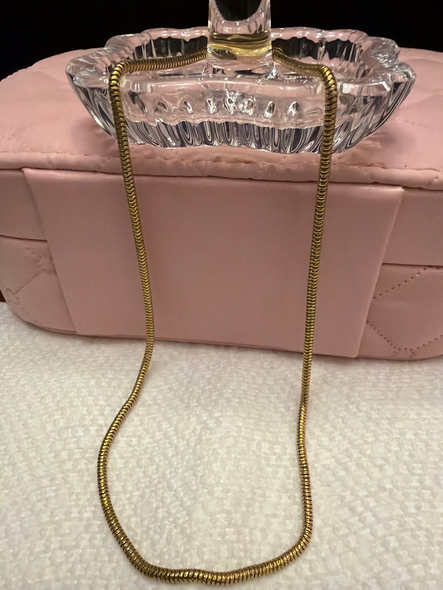 This set features a vintage gold-toned snake chain necklace draped over a decorative lead crystal trinket dish, set against a pink quilted vanity case. The necklace is a classic snake chain style, characterized by closely linked metal rings that create a smooth, flexible, tubular appearance. It possesses a bright yellow-gold finish and appears to be of standard length (approximately 16-18 inches), though the clasp is not visible. The crystal dish is rectangular with deep-cut vertical beveling and a scalloped rim, typical of mid-century pressed or cut glass vanity accessories. Centered within the dish is a small, ornate glass stopper or finial, suggesting this piece may be part of a larger perfume bottle or condiment set. The condition of the chain is excellent, showing a high luster with no visible kinks or oxidation. The crystal dish appears clear and bright, though some minor dust accumulation is visible in the facets. The pink background box features a quilted diamond pattern with a satin-like finish, possibly a vintage jewelry or cosmetics organizer. This assembly reflects a mid-to-late 20th-century aesthetic, likely dating from the 1960s to the 1980s, emphasizing traditional feminine elegance and Hollywood Regency style influences.