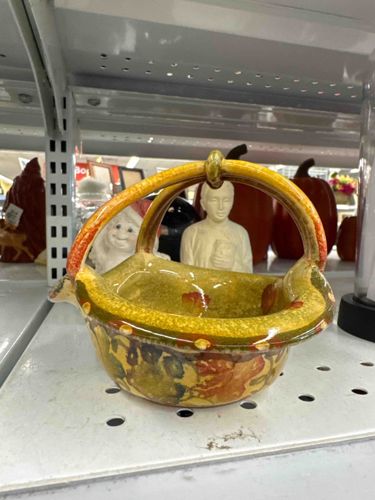 This item is a small, hand-painted ceramic decorative basket, likely weighing between 1 to 2 pounds and measuring approximately 6 to 8 inches in length. It is crafted from earthenware and features a rich, glossy glaze consistent with the Majolica style. The color palette is dominated by autumnal tones, including ochre yellow, burnt orange, and forest green. The exterior depicts stylized floral or fruit motifs in a painterly, somewhat rustic fashion. The basket features two integrated ceramic handles that arc overhead and meet at a central raised 'knot' or finial. The rim is embellished with a series of small, raised decorative bosses or dots in a lighter yellow glaze, adding a tactile element to the design. In terms of condition, there is a visible chip on the far left edge of the scalloped rim, exposing the underlying beige ceramic body. The glaze shows signs of fine crazing throughout, which is typical for pottery of this age and type. While no specific maker's mark is visible in this view, the style suggests a mid-20th-century European or American studio pottery origin. The overall craftsmanship is charming and artisanal, though the visible chip impacts the formal appraised value.