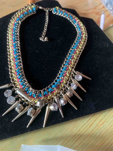 This contemporary bib-style necklace features a complex construction of polished gold-tone curb chains woven with vibrant secondary materials. The main body consists of four parallel gold-tone chains integrated with braided threads or narrow fabric cords in bright turquoise blue, pale yellow, and hot pink, creating a multi-textured, bohemian-punk aesthetic. The center front is heavily embellished with a series of dangling charms, including conical tapered spikes and faceted clear resin or glass 'crystals' in a mix of round and emerald cuts. The hardware appears to be base metal with a light gold-colored plating. The necklace is secured with a lobster claw clasp and includes a length-adjustable extender chain finished with a small metal bead. Overall, the piece displays a high-street fashion or costume jewelry quality from the early to mid-2010s. Condition appears fair with some minor tangling of the charms, potential light surface scratches on the metal plating, and fuzzing of the woven fibers. The craftsmanship is typical of mass-market fashion accessories, emphasizing bold visual impact over fine jewelry techniques.