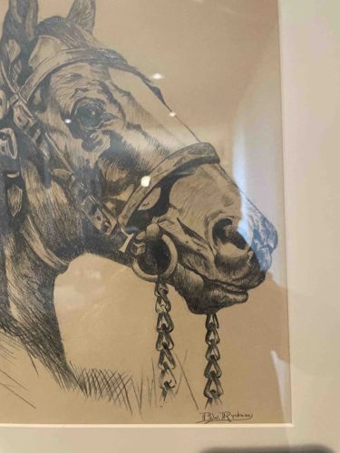 This is an original pencil or charcoal drawing on tan or buff-colored paper, featuring a detailed profile study of a horse wearing a bridle with heavy chains. The artwork is signed in the lower right corner as 'B.W. Ryckman'. The piece demonstrates high-quality realism with meticulous attention to detail, particularly in the rendering of the horse's musculature, the texture of the coat, and the sheen of the metal buckles and chains. Cross-hatching and varying line weights are used to create depth and shadow, especially around the eye and nose regions. The horse is depicted with a focused expression, and the hardware suggests a draft or work horse context. The paper appears to be in good condition, though it is housed behind glass which causes some reflective glare in the image; the white border suggests it is professionally matted. Based on the style and signature, it appears to be a mid-to-late 20th-century piece of Western or equine fine art. The craftsmanship is excellent, showing a strong command of anatomical accuracy and value contrast. No significant tears, foxing, or fading are visible from the image provided, although there is a slight natural texture to the paper substrate.