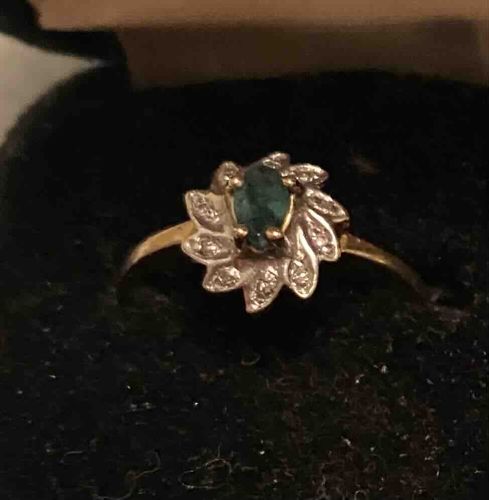 This item is a decorative ring featuring a central marquise-cut green gemstone, likely an emerald, set within a yellow gold mounting. The central stone is surrounded by a swirling 'sunburst' or 'ballerina' cluster of small, round white stones, which appear to be single-cut diamonds. These accent stones are set into white gold or rhodium-plated illusion settings to enhance their size and sparkle. The shank of the ring is a slender, polished yellow gold band. Structurally, the ring exhibits a late 20th-century aesthetic, likely manufactured between the 1970s and 1990s. The emerald shows a deep green hue with visible natural inclusions typical of the species. The condition appears fair with some minor surface wear on the gold band and potential blunting of the facet edges on the emerald, suggesting some light over-time use. No prominent maker's marks are visible in the photograph, though they would likely be found on the interior of the shank. The craftsmanship is commercial grade, representative of fine jewelry commonly sold in retail department stores during its era of production.