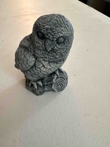 This item is a decorative owl figurine perched upon a textured log base. The piece is crafted from a heavy composite material, most likely a graphite-infused resin or crushed stone typical of the 'Wolf Sculptures' or 'Stone Hens' style commonly produced in Canada. It measures approximately 4-5 inches in height and features a monochromatic gray color palette with a charcoal-toned wash used to accentuate the deeply incised details. Physically, the owl is depicted with a highly stylized, dense feather pattern that gives it a tactile, scalloped texture. Its eyes are large, almond-shaped, and deeply recessed, while the beak is small and pointed downward. The base represents a cut log, showing concentric growth rings on the ends and a jagged bark texture where the owl's talons are gripped. The condition appears fair to good; there is visible surface wear and slight discoloration along the lower edge of the log, suggesting age-related patina or shelf-wear. There are no major fractures visible from this angle, though the matte finish shows slight rubbing. This style of sculpture was popular in the late 20th century (circa 1970s-1980s) as a rustic souvenir or collectible folk-art piece. The craftsmanship is decent for a mass-produced resin item, utilizing a mold-cast process that captures fine serrated textures across the wings and facial disc.