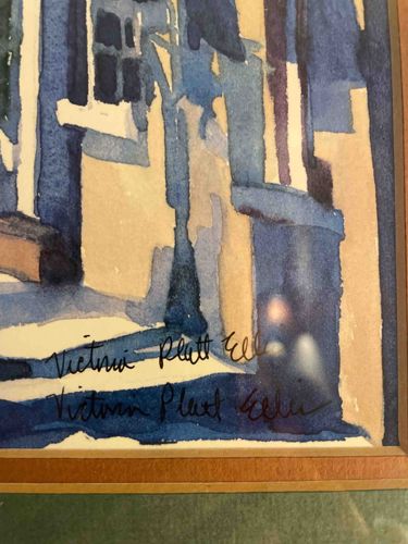 This item is an original watercolor painting on paper, prominently featuring the artist's signature 'Victoria Platt Ellis' twice in the lower portion of the visible composition. The artwork depicts an architectural scene, likely a building or streetscape, executed in a loose, expressionistic watercolor style. The color palette is dominated by various shades of blue, ranging from deep indigos to pale sky blue, accented by cream and off-white negative spaces that suggest sunlight hitting walls. The brushwork shows a wet-on-dry technique with visible pigment pooling and sharp edges in the shadows. The painting is housed under glass with a dual matting system, including a thin gold or wood-toned inner fillet and a larger green outer mat. Notable is the double signature in black ink, which may indicate a correction or a deliberate stylistic choice by the artist. Physically, the paper appears to be a heavy-weight watercolor stock with a slight texture. The condition seems excellent with no visible foxing, fading, or moisture damage to the exposed area, though a slight glare on the glass surface is present in the photograph. Victoria Platt Ellis is known for her architectural and landscape works, often capturing light and shadow in a rhythmic, semi-abstract manner that dates from the late 20th to early 21st century.