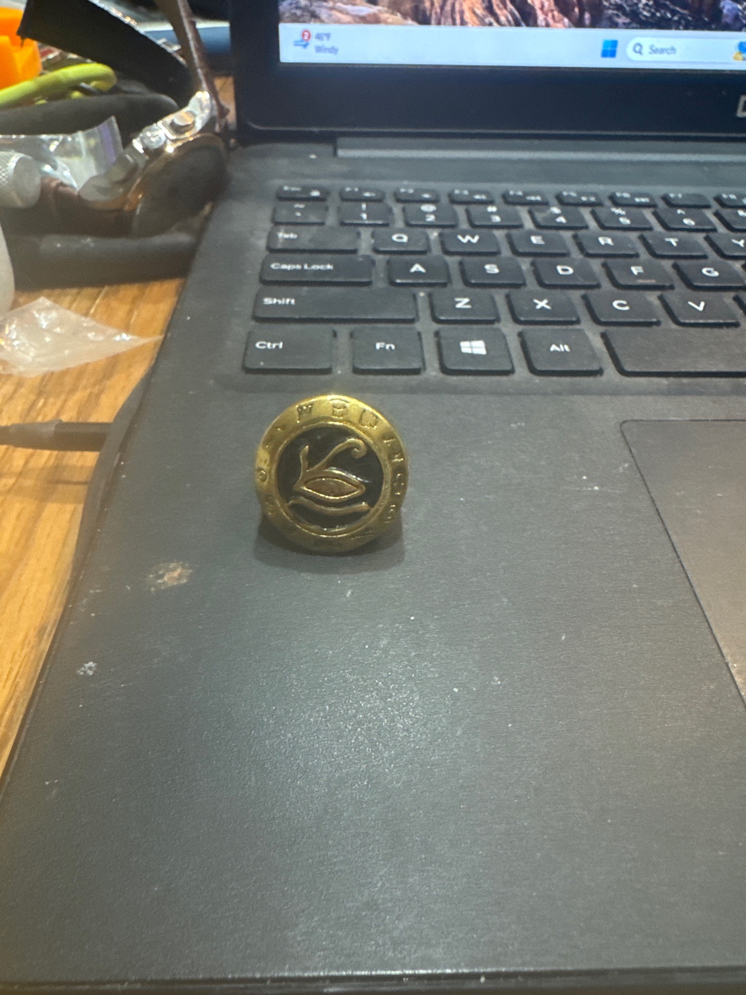 This item is a circular, signet-style accessory, likely a lapel pin, shank button, or small medallion, featuring a central Eye of Horus (Wedjat) motif. The piece is constructed from a gold-toned base metal, possibly brass or a gold-colored alloy, with a dark, possibly blackened or patinated recessed background that provides high contrast to the raised central emblem. The outer border is framed by a raised rim engraved with various symbols or pseudo-glyphs that appear to be decorative rather than linguistic. In terms of condition, the item shows significant surface wear, including small scratches, pitting, and a dulling of the original metallic luster consistent with age and frequent handling. The dark infill in the recessed areas shows some unevenness, which could be intentional patination or accumulated debris over time. The craftsmanship is of a commercial or mass-produced quality, common in mid-to-late 20th-century costume jewelry or novelty accessories. The design reflects an 'Egyptian Revival' aesthetic, a style that periodically peaks in popularity. The reverse side is not visible, making it difficult to confirm the attachment type (e.g., pin back or button shank), but its overall weight and size suggest it was intended for personal adornment on clothing.
