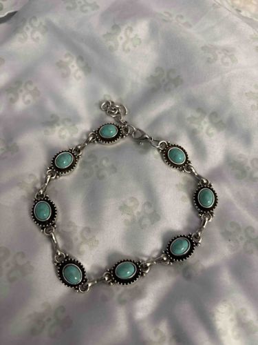 This jewelry item is an ankle bracelet featuring eight oval turquoise cabochons set in a silver-toned metal (likely sterling silver or a base metal alloy with antiqued plating). Each stone is approximately 8-10mm in length and exhibits a uniform robins-egg blue hue with subtle dark matrix inclusions characteristic of stabilized turquoise. The stones are bezel-set within oval frames adorned with decorative 'rope' or 'beaded' borders, a classic motif in Southwestern and Bohemian jewelry design. The individual link segments are connected by sturdy circular jump rings, leading to a secure lobster claw clasp and a short extender chain with a decorative circular end-charm, which allows for size adjustment. Regarding condition, the metal shows a deliberate dark patina in the recessed areas to enhance the textured details, while the high points show minor surface scratches from regular wear. The stones appear securely set with no visible cracks or loosening. The craftsmanship suggests a contemporary mass-market production rather than a late 20th-century artisan piece, though it mimics traditional Navajo and Zuni aesthetics. No distinct maker's marks are visible on the clasp in this view, suggesting generic manufacturing.