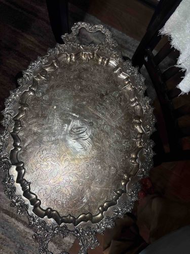 Ornate Silver-Plated Chased Oval Serving Tray with Grapevine Border