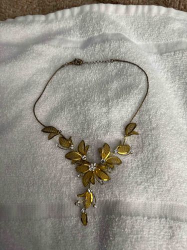 This item is a vintage gold-tone choker-style necklace featuring an elaborate floral design adorned with clear rhinestones. The necklace chain appears to be a delicate, possibly serpentine or box link, terminating in an adjustable chain length with a small, ornate clasp, which is visible in one of the crop images. The dominant central motif is a cluster of approximately five gold-toned flowers, each crafted from thin metal, giving them a slightly three-dimensional quality with gently curved petals. Several smaller individual flowers and leaves extend upwards and downwards from this central cluster, creating an asymmetrical cascade effect. Each flower and some of the leaf elements are embellished with small, round, clear rhinestones, typically arranged in clusters of two or three per floral element, simulating dew drops or central stamens. The metal has a slightly aged, antique gold finish, showing some areas of possible wear or patina, particularly on the chain and the backside of the floral elements. There are no readily discernible maker's marks or signatures visible in the provided images. The craftsmanship suggests a costume jewelry piece from the mid-20th century, likely between the 1950s and 1970s, due to its design aesthetic and material choice. The construction appears to be well-executed for costume jewelry, with individual elements attached securely. No major damage or missing stones are apparent, though a closer inspection would be needed to confirm the condition of every rhinestone setting and the integrity of the gold-tone plating across all surfaces.