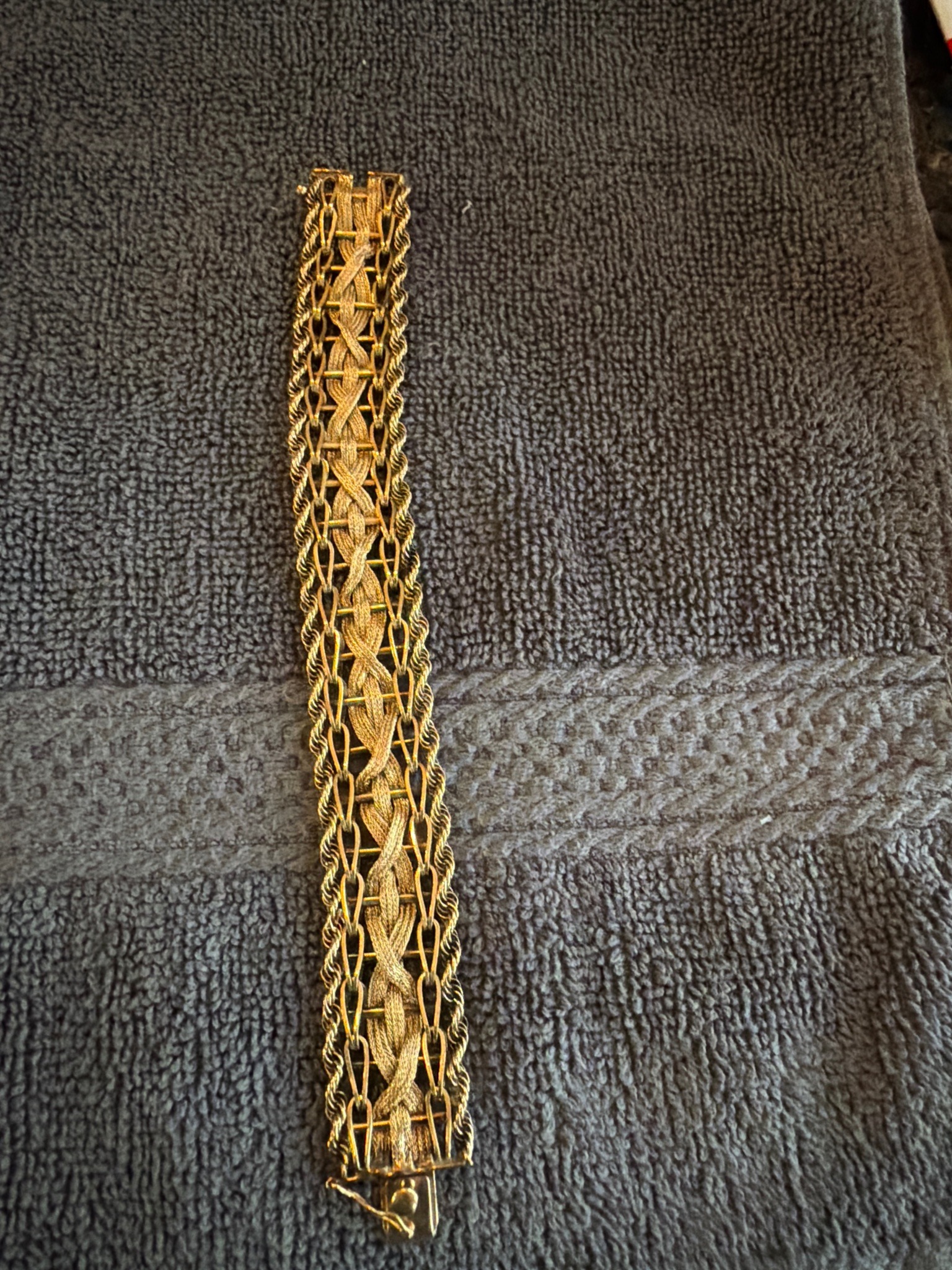 This is a wide, vintage-style yellow gold bracelet featuring a complex multi-row construction. The central motif consists of a textured, flat braided mesh decorative band. Flanking this central weave are structured open-rectangular links, which in turn are bordered by dual twisted rope-style chain edges on both sides. The piece displays a high level of craftsmanship with its intricate, multi-layered assembly. Based on the style and construction, it appears to be a Mid-Century or Retro-era piece, likely dating from the 1950s to 1970s. The metal exhibits a warm, rich yellow luster consistent with 14k or 18k gold. The closure features a substantial box clasp with a visible safety catch (eight-loop style) for added security. Condition-wise, the bracelet shows minor wear consistent with age, including light surface scratches and localized areas of darker patina within the deep crevices of the rope and mesh portions. The overall structure appears sound, with no visible broken links or significant deformations to the mesh weave. There are no maker's marks visible in the primary photograph, though they would traditionally be found on the interior or tongue of the clasp.
