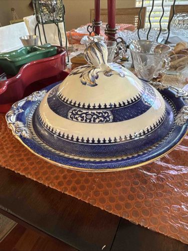 Victorian Era Flow Blue Covered Tureen or Vegetable Dish