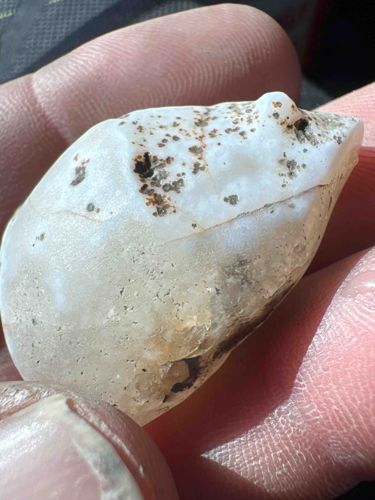 This is a naturally occurring water-worn chalcedony or agate stone, small enough to be held comfortably between two fingers, suggesting a diameter of approximately 1.5 to 2 centimeters. The specimen displays a predominantly milky white to translucent waxy luster, characteristic of microcrystalline quartz. A defining feature is the presence of dark brown to black dendritic or moss-like inclusions, likely manganese or iron oxides, which appear as a concentrated cluster of spots on the upper surface. The stone has a smooth, rounded, almost egg-like shape, though one side appears more angular or fractured, indicating a natural break or cleave. There is a visible linear fissure or hairline crack running horizontally across the mid-section. The surface texture varies from highly polished and smooth to slightly pitted with minute indentations, known as 'chatter marks,' which occur due to the stone tumbling in a high-energy water environment like a riverbed. There are no signs of human manipulation, artificial carving, or maker's marks, characterizing it as a raw mineral specimen. The unique visual appeal lies in the pareidolia effect, where the specific arrangement of the inclusions and the rounded contours vaguely resemble a profile or face, though this is a natural geological coincidence rather than intentional craftsmanship.