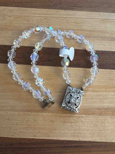 Vintage Aurora Borealis Crystal Bead Necklace with Art Deco Sterling Silver Rhinestone Clasp