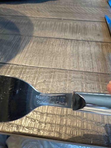 This item is a contemporary stainless steel culinary utensil, specifically appearing to be a serving spoon or similar tool from a kitchen set. The construction features a polished, high-shine silver finish across its entirety. The neck of the utensil is stamped with a clear manufacturer's mark reading 'MasterChef™' followed by 'Stainless China' on a second line, indicating its origin and material composition. The design incorporates a rounded, ergonomic handle that joins the functional head via a tapered bolster. The materials used are durable, food-grade stainless steel, common in modern mass-produced kitchenware. Regarding condition, the surface shows visible signs of regular use, including fine scratches, water spots, and minor surface oxidation or residue buildup particularly near the junction of the handle and neck. There are no signs of heavy structural damage or deep pitting, suggesting a functional status. This style of kitchen tool is characteristic of the late 20th to early 21st century, often sold as part of licensed cookware branding associated with the popular MasterChef franchise. The craftsmanship is industrial and standardized, emphasizing utility and easy maintenance over artisanal uniqueness.