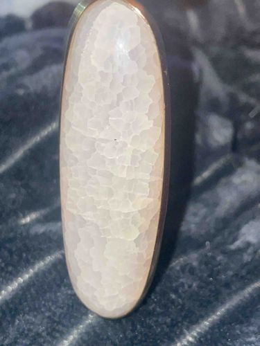 This piece features a large, vertically elongated oval cabochon of natural 'Snakeskin' Agate, a variety of chalcedony characterized by its translucent white to pale cream color and a distinctive textured surface pattern reminiscent of reptile scales. The gemstone showcases a delicate internal play of light through its crystalline, botryoidal structure. It is securely housed in a sleek, minimalist bezel setting made of polished white metal (likely sterling silver or white gold), which follows the smooth contours of the stone. The agate possesses a soft, waxy luster and high translucency across its face. Regarding condition, the stone appears to be well-polished with no significant surface fractures or chips visible, though one small dark inclusion or surface speck is present near the center. The metal rim shows minimal signs of wear and age-related patina. The craftsmanship is contemporary, highlighting the natural organic beauty of the mineral through a simple, modern design. Based on its style and material composition, this item appears to be a handcrafted piece of artisan jewelry from the late 20th or early 21st century.
