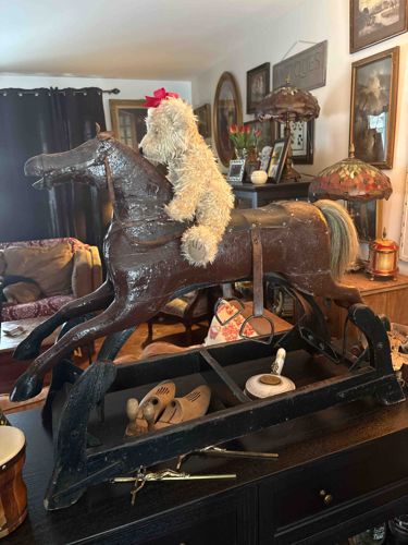 This is a large antique-style glider rocking horse, likely dating from the late 19th to early 20th century. The horse features a classic carved wooden body with a textured, gesso-applied finish painted in a dark mahogany brown tone. It is mounted on a sturdy black-painted wooden safety stand, specifically a 'glider' mechanism which uses iron swing arms to allow for back-and-forth movement without the footprint of traditional bow rockers. The horse retains several original or early period-correct features, including a leather saddle and bridle, stirrups, and a real horsehair tail in a blonde-grey hue. The anatomy is stylized yet detailed, with an open mouth and carved musculature. Notable condition issues include significant paint loss, cracking, and surface crazing across the body, which indicates considerable age and a heavy patina. There is visible wear on the leather components. The craftsmanship is substantial, suggesting a high-quality manufacturer from the Victorian era. Atop the horse sits a modern plush teddy bear with a red bow, which is not original to the piece.