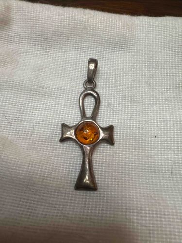 Silver Ankh Cross Pendant with Amber Inlay
