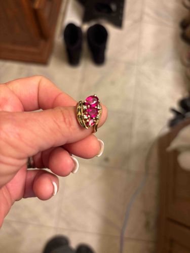 This item is a decorative cocktail or cluster ring featuring three vertically aligned faceted stones, most likely rubies or lab-created red gemstones, set in a yellow gold mounting. The stones are oval-cut and exhibit a vibrant, saturated pinkish-red hue. Surrounding the center stones are small, white accent stones that appear to be diamonds or cubic zirconia, set within a tiered, bypass-style gold shank. The yellow gold setting has polished ribbons of metal that wrap around the gems, providing a sense of movement. Based on the design, this piece likely dates from the late 20th century, approximately the 1980s or 1990s, a period popular for bold, multi-stone gemstone rings. The metal shows minor surface scratches consistent with moderate wear, but the prongs appear intact and secure. No clear hallmark is visible in the provided image, but common purity for this style would be 10k or 14k gold. The overall craftsmanship suggests a mass-market fine jewelry piece intended for formal or daily wear.