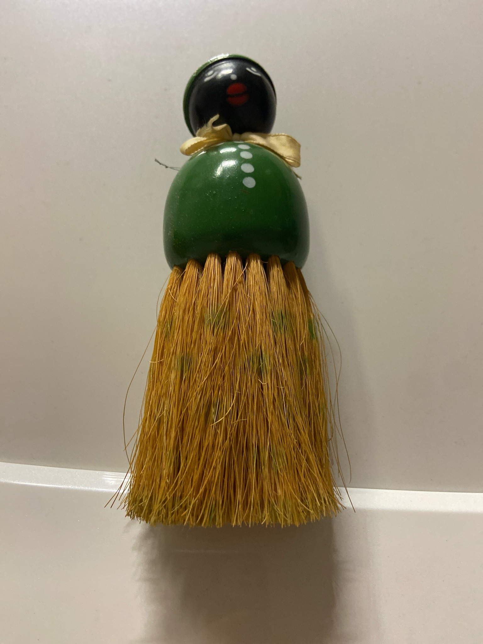 This is a vintage hand-painted wooden clothes or whisk brush fashioned in the form of a stylized female figure, characteristic of mid-20th-century 'Black Americana' memorabilia. The item stands approximately 6 to 8 inches tall and is constructed from turned wood components. The head is a spherical wooden bead painted black with simplified facial features including white eyes and a red mouth. It is topped with a flat green wooden hat and features a small fabric ribbon tied around the neck. The body is a rounded, dome-shaped green piece of wood decorated with a vertical row of white dots representing buttons. The lower portion consists of natural straw or stiff vegetable fiber bristles bundled and inset into the wooden base. The overall condition appears good for its age, showing minor surface wear to the paint, particularly around the edges of the hat and base, and fraying of the neck ribbon. The bristles show some slight splaying but remain largely intact and operational. This piece likely dates from the 1930s to the 1950s and represents a period of novelty domestic items that utilized racial caricatures for functional kitchen or dressing table accessories. No specific manufacturer's mark is visible in the image, though these were commonly produced in Germany or Japan for the American export market.