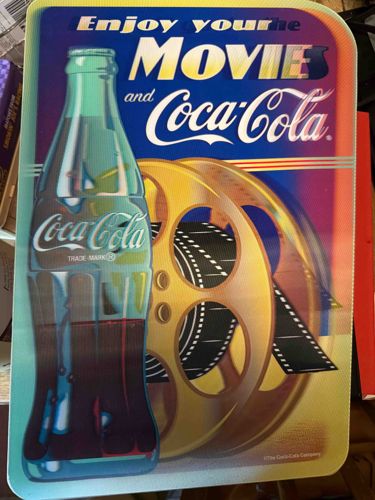 This item is a rectangular commemorative placemat or small sign featuring a modern graphic design that integrates Coca-Cola branding with cinema motifs. The composition displays a classic contour glass bottle of Coca-Cola on the left, rendered with teal and dark amber tones to suggest a full bottle. To the right, two stylized gold film reels with black film strips are depicted. The background transition consists of vibrant blue, orange, and purple gradients. The text reads 'Enjoy your MOVIES and Coca-Cola,' with the 'Coca-Cola' in its iconic white Spencerian script. Physically, the item appears to be made of thin, flexible plastic or laminated cardstock with rounded corners. It exhibits a distinct cross-hatched or textured surface, likely a protective finish or a holographic/lenticular overlay commonly used in promotional items from the late 1990s or early 2000s. There is visible minor wear along the edges and small surface scratches consistent with use as a household utility item. A copyright notice for 'The Coca-Cola Company' is visible in the bottom right corner. The overall craftsmanship is commercial-grade, produced for high-volume promotional distribution rather than as a limited art piece.