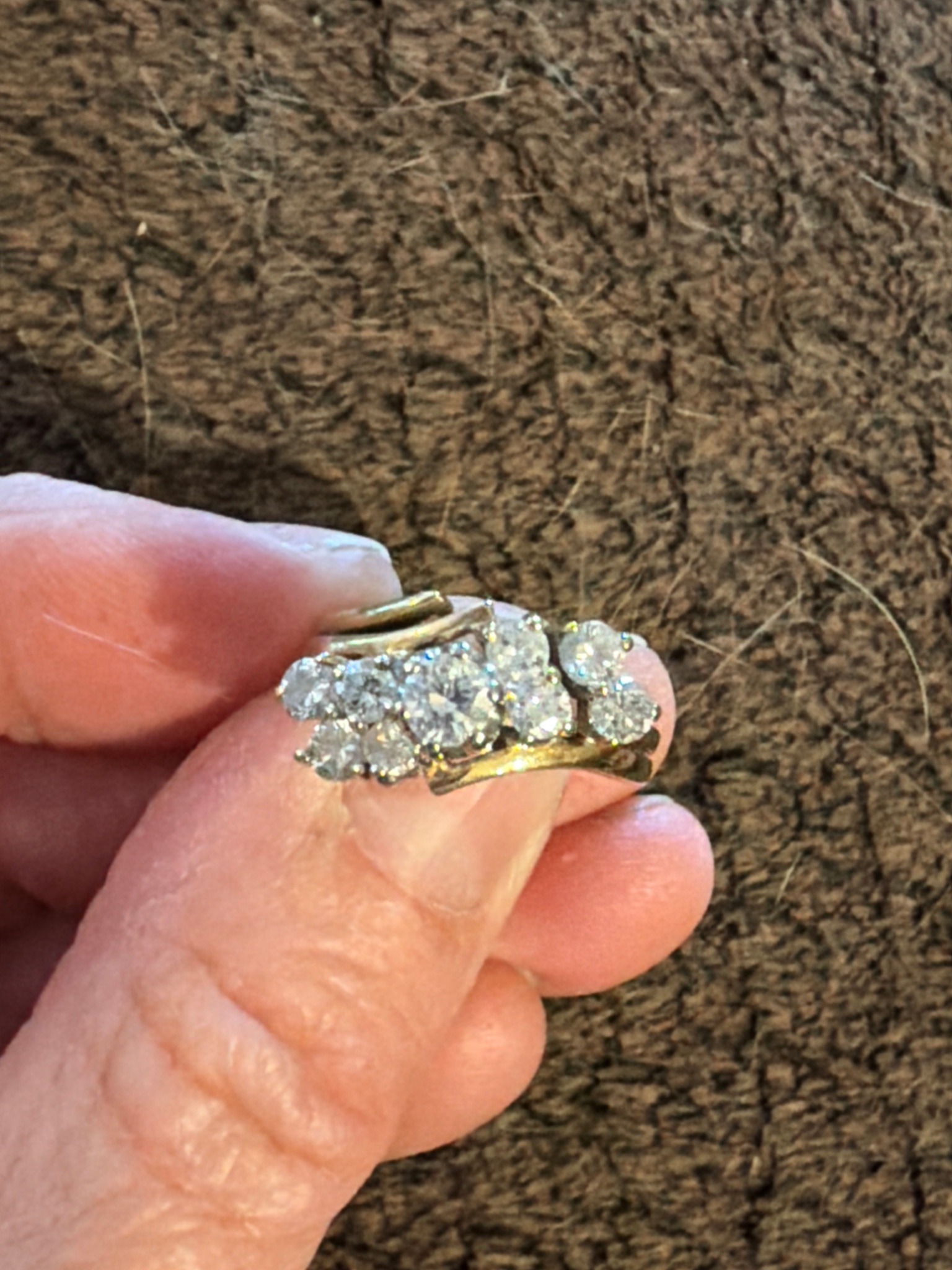 This is a contemporary-to-vintage style multi-stone cluster ring, often referred to as a 'waterfall' or 'stair-step' design. The ring features approximately seven to nine round brilliant-cut stones, which appear to be diamonds, though they would require testing to confirm if they are natural, lab-grown, or simulants such as cubic zirconia. The stones are arranged in a dynamic, tiered formation held by individual prongs. The central stone is the largest, flanked by slightly smaller graduated stones that create a sense of movement. The band is crafted from yellow metal, most likely 10k or 14k yellow gold based on common manufacturing standards for this style. The metal displays a polished finish with some visible surface scratches and minor patina, suggesting regular wear. The prongs appear intact, though some may require tightening by a jeweler for long-term security. The bypass-style shoulders of the ring curve elegantly around the central cluster, adding to the fluid aesthetic. No maker's marks or fineness stamps are visible in this view, but they are likely located on the inner shank. This style was particularly popular from the late 1970s through the 1990s.
