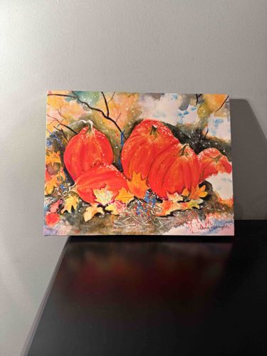This item is a contemporary, landscape-oriented still life painting featuring a cluster of pumpkins nestled among fallen autumn leaves. The artwork appears to be a mixed-media piece, potentially watercolor or gouache with ink accents, executed on a gallery-wrapped canvas or a thick art board. The palette is dominated by vibrant, warm tones: brilliant oranges and reds define the pumpkins, while golden yellows and ochres represent the foliage. These are contrasted against a background of cool blues, soft greens, and neutral whites, suggesting a crisp fall day. The brushwork is expressive and fluid, utilizing 'wet-on-wet' techniques to create soft gradients on the pumpkins' skins, combined with sharper, linear details to define the stems, leaf veins, and dark, skeletal branches in the background. A notable feature is the artist's signature in the bottom right corner, which appears to be 'Dianne [Last Name]', though the surname is partially stylized. The condition appears excellent with no visible fading, tears, or cracking. The absence of a traditional frame suggests a modern aesthetic. The style is representational with a nod to impressionistic color play, likely produced within the early 21st century. The craftsmanship shows a confident hand with a strong grasp of light and shadow, using white highlights to create a sense of three-dimensional form and glossy surface texture on the pumpkins.