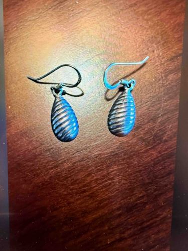 A pair of vintage-style dangle earrings featuring a teardrop or ovoid-shaped drop. Each drop is constructed from metal, likely sterling silver based on the characteristic dark oxidation and patina visible in the recessed grooves. The surface of the teardrops features a rhythmic, horizontal ribbed or gadrooned texture that encircles the form, providing visual depth and a tactile quality. The metal showcases a mix of polished high points and darkened valleys, highlighting the craftsmanship of the texture. The drops are suspended from simple French hook (shepherd's hook) ear wires, which appear to be attached via a small integrated loop at the tip of the teardrop. Measuring approximately 0.5 to 0.75 inches in length for the drop alone, they represent a classic mid-to-late 20th-century jewelry design. The condition shows moderate tarnish and surface patina consistent with age and use, particularly near the attachment points and within the ribbing. No prominent maker's marks are visible in the image, but the construction suggests a mass-produced yet quality boutique jewelry piece, possibly southwestern or minimalist in aesthetic. The wires show slight irregularity, suggesting they may have been gently bent through repeated wear over several decades.