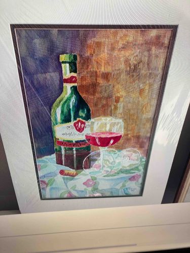 This is an original watercolor painting on paper depicting a still life composition of a wine bottle and a filled wine glass. The artwork is characterized by a vibrant color palette, featuring a green glass bottle with a stylized red and white label, and a stemmed glass containing red liquid. The subjects rest upon a patterned tablecloth with floral motifs in shades of blue, pink, and green. The background is divided vertically: the left side employs cool purple and blue tones, while the right side utilizes warm ochre, gold, and brown hues in a suggestive, blocky brushwork style. The artist, P. Dunn, has signed the work in the lower right-hand corner. The piece is presented behind a white window mat and appears to be housed in a simple dark wooden or metallic frame with a thin gold-toned inner fillet. The style is mid-to-late 20th-century impressionistic realism. Regarding condition, the paper appears flat with no visible foxing; however, there is a slight moiré pattern or texture visible in the digital capture which may be due to the paper texture or the photography method. The craftsmanship shows confident, loose brushwork and effective use of transparency, typical of an experienced hobbyist or professional watercolorist. No significant damage such as fading or water staining is immediately apparent.