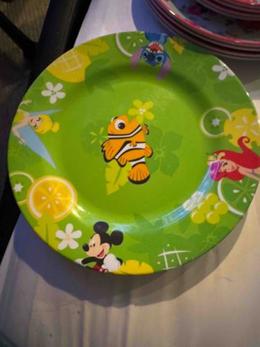 This is a circular children's plate featuring various licensed Disney characters set against a vibrant tropical theme. The plate is constructed from melamine, a durable and shatter-resistant plastic-like material commonly used for casual dinnerware. The primary background color is a bright lime green, adorned with subtle darker green leaf patterns and illustrative motifs including yellow citrus slices (lemons/pineapples), white flowers, and citrus wedges. The center of the plate features Nemo from Finding Nemo, while the rim is decorated with Mickey Mouse, Tinker Bell, Stitch, and Ariel the Little Mermaid. The characters are rendered in a modern, stylized cartoon aesthetic. Physically, the plate appears to be approximately 8 to 9 inches in diameter with a standard raised rim. The surface shows some light reflective glare, suggesting a glossy finish. Regarding condition, there are minor visible surface scratches and 'utensil marks' consistent with regular household use, particularly in the center well area. There are no obvious cracks or large chips visible in the photograph, though the edge shows slight thinning of the decorative decal typical of mass-produced melamine. This item likely dates from the early to mid-2000s, reflecting Disney's cross-franchise branding strategy during that era. It is a functional piece of licensed character merchandise intended for daily domestic use.