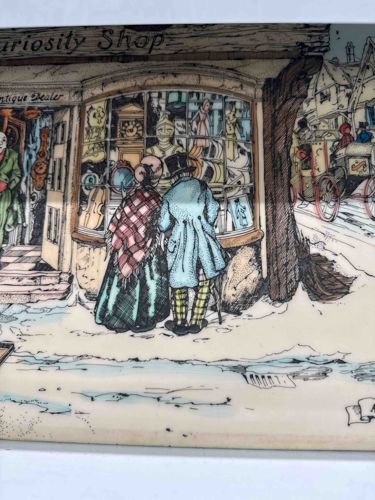 This item is a decorative rectangular ceramic serving tray or plate featuring a detailed transferred scene titled 'The Old Curiosity Shop,' inspired by the Charles Dickens novel. The illustration depicts a Victorian-era couple in period dress peering into the bay window of an antique dealer’s shop. The man wears a top hat and a light blue frock coat with yellow patterned trousers, while the woman wears a red and black plaid shawl and a green skirt. Inside the shop window, various antiques are visible, including a suit of armor, a grandfather clock, and a ship model. The construction is fine-grade earthenware with a cream glaze (typical of Royal Doulton’s Dickens Ware series). The colors are applied via a multi-colored lithographic transfer process, accented with fine black line work. The style is quintessentially 19th-century English narrative illustration, likely produced in the early to mid-20th century (circa 1930s-1950s). In terms of condition, there is visible minor crazing throughout the glaze, which is common for aged earthenware, along with some slight discoloration along the bottom edge where dust or moisture may have settled. Some minor black speckling—known as 'kiln dirt' or 'flea bites'—appears beneath the glaze, suggestive of its original manufacturing era. No significant chips or cracks are visible in the provided image.