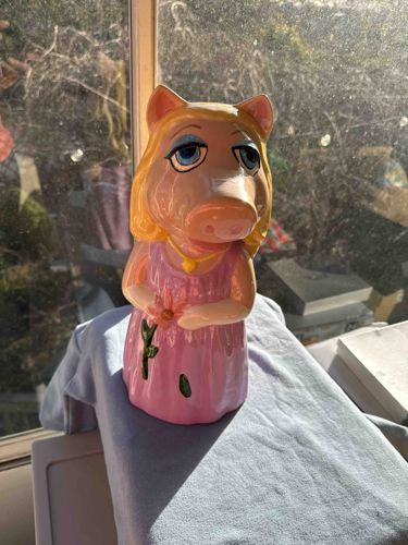 This item is a vintage ceramic figural bank depicting the iconic Muppets character, Miss Piggy. The figure stands approximately 8 to 10 inches tall and is constructed from glazed earthenware or slip-cast ceramic. Miss Piggy is featured in her signature style with blonde hair, distinctive blue eyes with heavy eyelashes and blue eyeshadow, wearing a lavender or light purple dress. She is depicted holding a single pink flower with a green stem and wearing a yellow necklace. The bank possesses a high-gloss finish, reflecting a mid-to-late 20th-century mass-production aesthetic, likely dating from the late 1970s or early 1980s during the height of The Muppet Show's popularity. The craftsmanship shows standard commercial quality for licensed character merchandise of that era, with hand-painted details over molded forms. Notable condition aspects include small chips or 'flea bites' on the glaze, particularly visible on the ears and the base. There is no visible maker's mark on the front, but such pieces were commonly produced by companies like Sigma or Gorham under Henson licensure. The piece shows some light surface dust and minor age-related crazing in the glaze, which is typical for vintage ceramic banks. No significant structural cracks or major repairs are evident from this angle.
