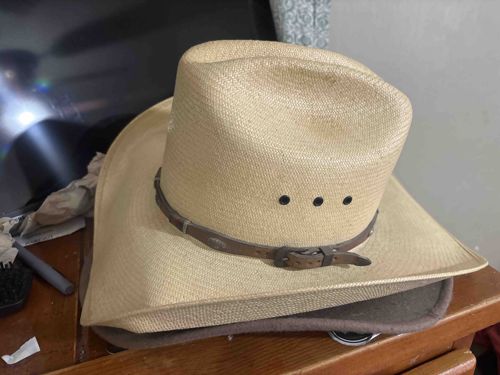 This item is a classic western-style cowboy hat constructed from a tightly woven, natural-colored straw. The crown features a cattleman crease with a high profile, accompanied by three black-rimmed ventilation eyelets on each side to ensure breathability. The brim is wide with a structured, upward curve on the sides, characteristic of modern rodeo or ranch styles. A notable feature is the decorative brown leather hatband, which shows intricate floral or geometric leaf-pattern tooling and is secured with a small silver-toned buckle set and a leather keeper. While no internal maker's marks are visible in the photo, the quality of the weave suggests a mid-range commercial production, likely from the late 20th or early 21st century. The straw displays a uniform light beige or cream patina. In terms of condition, the hat appears well-maintained with its shape firmly held, though there is a slight darkening of the leather band consistent with age and handling. The edges of the brim show minimal fraying, indicating light previous use. The hat is resting on top of a dark brown felt or wool hat, serving as a protective layer during storage.