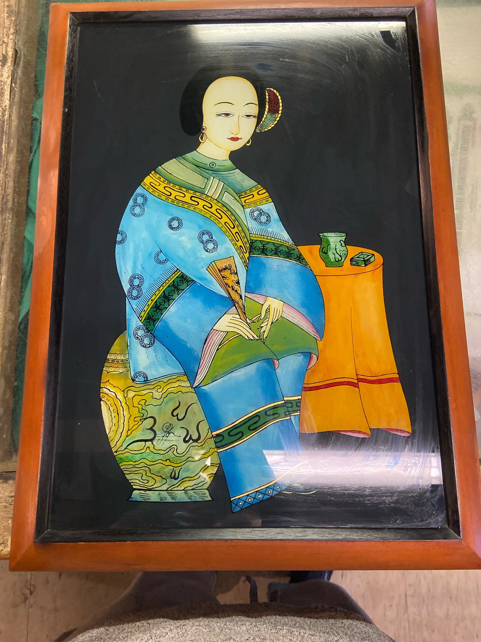 This is a decorative Chinese reverse glass painting depicting an elegant court lady seated beside a small table. The central figure is dressed in elaborate traditional robes of vibrant turquoise and blue, featuring intricate patterns of circles and yellow scrollwork along the borders. She holds a small fan and sits atop a large, decorative yellow and green ceramic vessel with calligraphic-style markings. To her right, a bright orange table holds a green jade-colored cup and a small box. The background is a solid, deep black lacquer-style finish, which makes the foreground colors pop. Reverse glass painting is a demanding technique where the artist paints on the back of a glass pane, requiring the layers of detail to be applied in reverse order. The style suggests a mid-20th-century production, likely for the export market, mimicking earlier Qing Dynasty aesthetics. The piece is housed in a simple rectangular wood frame with a polished reddish-brown finish and a black inner bevel. Concerning condition, the glass surface shows visible surface scuffing, scratches, and circular smudges, likely from improper cleaning or handling. There is a notable white haze or streak across the lower right quadrant of the glass. The paint itself appears mostly intact without major flaking (delamination), though some fine cracking may be present upon closer inspection. The wooden frame is in fair condition with minor abrasions consistent with age. There are no visible maker's marks or signatures on the face of the artwork.