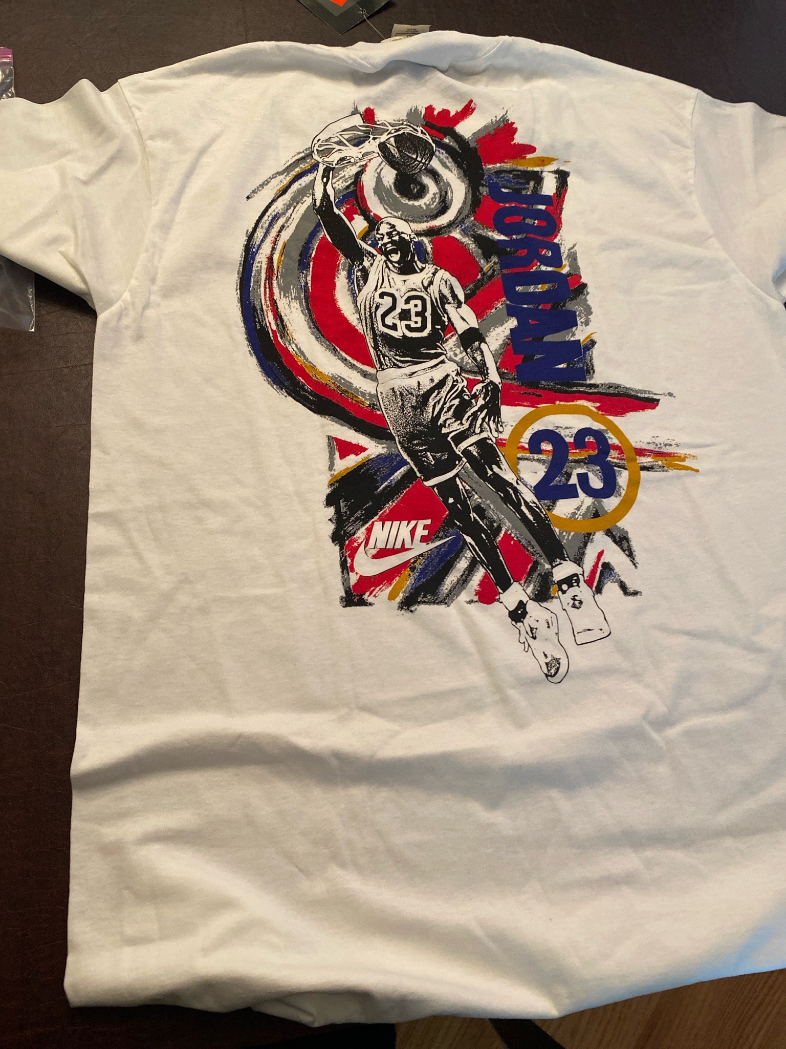 This is a vintage short-sleeve crewneck t-shirt manufactured by Nike, featuring an iconic graphic of Michael Jordan. The shirt is constructed from a heavyweight white cotton fabric, typical of athletic apparel from the early to mid-1990s. The central graphic is a large, multi-colored screen print utilizing a 'brush-stroke' or abstract expressionist art style. It depicts Michael Jordan in his Chicago Bulls home jersey (number 23) in mid-air during a dunk. The color palette includes vibrant primary shades of red, blue, and yellow, accented with black and grey textured strokes. Notable elements include the 'JORDAN' text in bold blue block letters, a secondary '23' encased in a yellow circle, and a classic Nike swoosh logo within a red-and-white 'bark' textured box at the bottom left of the print. The garment appears to be in excellent deadstock or near-mint condition, showing very crisp graphics with no visible cracking, fading, or peeling. The white fabric remains bright without yellowing or staining, and the collar retains its shape, suggesting it may still have original retail tags attached (visible at the neckline). This item represents the height of 90s sports culture and Nike's 'Flight' era marketing, making it a highly collectible piece of sportswear memorabilia.