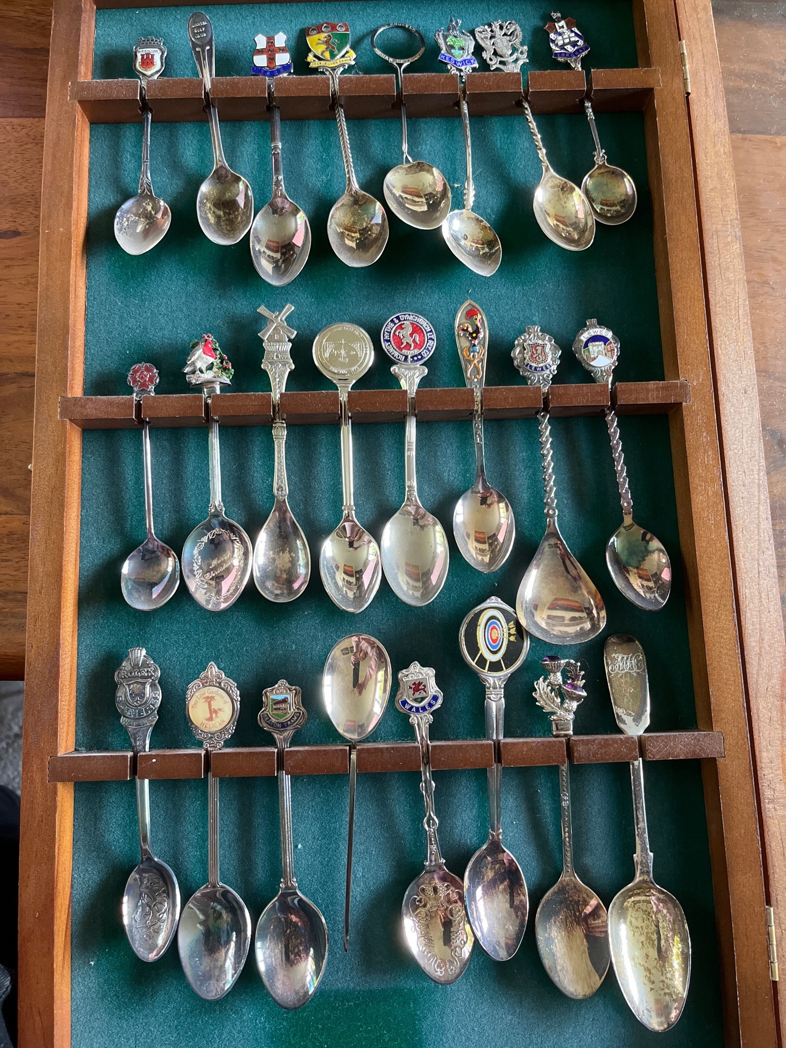 This is a diverse collection of approximately 24 souvenir teaspoons housed in a wooden, hinged display case with a green felt liner. The spoons are primarily constructed from sterling or silver plate, featuring a variety of decorative finials including polychrome enamel shields, figural motifs like a windmill and thistle, and embossed crests representing various locations and organizations such as Gibraltar, Llandudno, and various golf clubs. Construction styles range from simple flat handles to elaborate twisted stems. Several spoons exhibit decorative engraving within the bowls, notably one with 'Merry Christmas' and another with floral patterns. The collection spans various eras, likely from the late 19th century to the mid-20th century, evidenced by the stylistic differences in the enamel work and hallmarking styles visible on the reverse of the stems. Condition varies across the set; several pieces show significant tarnish and patina development, particularly in the bowls, which is expected for silver of this age. One spoon in the bottom row appears heavily worn with surface pitting. The craftsmanship indicates a mix of mass-produced souvenir ware and more detailed, artisanal silversmithing seen in the intricate cast finials and enamel application.