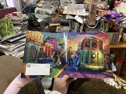 This item is a printed promotional catalog or direct mail publication from StreetcarShops.com, specifically marked as 'Q4 2021' on the bottom of the front cover. The piece features a vibrant, stylized artistic illustration spanning the front and back covers, depicting a quintessential New Orleans street scene. On the right panel (front), a classic green New Orleans Perley Thomas-style streetcar numbered '924' is prominent against a sunset sky. The left panel (back) shows historic French Quarter-style architecture with wrought-iron balconies and a lively street parade featuring musicians and pedestrians. The artwork utilizes a bold, saturation-heavy expressionist style with a palette of deep greens, purples, oranges, and yellows. The item appears to be a staple-bound booklet or a gatefold flyer printed on gloss-coated medium-weight paper stock, standard for high-quality commercial marketing materials. It includes a dedicated white mailing block on the back cover with a QR code and placeholder text for 'StreetcarShops.com' address and postage. The condition appears excellent with no visible creasing, tearing, or foxing, maintaining sharp corners and high ink saturation. This contemporary piece serves as a commercial graphic arts collectible showcasing New Orleans-themed transit and lifestyle branding.