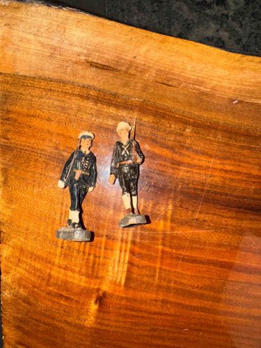 A pair of vintage German toy soldiers manufactured by O. & M. Hausser under the brand name Elastolin. These figures are constructed from 'composition,' a mixture of sawdust, casein glue, and kaolin, molded over a wire armature and hand-painted. The soldiers appear to represent naval infantry or marines from the early 20th century, specifically the WWI to interwar period. One figure is wearing a peaked cap while the other wears a distinctive white tropical or pith-style helmet, both dressed in dark navy blue uniforms with white gauntlets or leggings and carrying rifles on their shoulders. Physically, each figure stands approximately 7cm to 7.5cm tall on a characteristic oval composition base. The condition shows visible age, including significant paint wear and surface abrasions, particularly on the highlight areas like the hands and hats. A notable crack or structural weakness is visible near the ankles of the figure on the right, which is a common issue with composition material as the wire internal support can rust and cause the material to swell and crack over time. The craftsmanship is typical of high-quality mid-century German production, with expressive faces and detailed uniform molded details. These figures are highly collectible examples of German militaria toys from the 1930s-1940s.