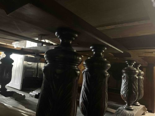This item is the substantial supporting base of a 'Barnard' style buffet or sideboard, showcasing a multi-pedestal construction typical of high-end formal dining furniture. The base features several robust, hand-carved solid wood pedestals, each finished in an exceptionally dark, espresso-toned or ebony stain with an aged patina. The pedestals are designed with a classic urn-shaped silhouette, featuring intricate acanthus leaf carvings cascading down the central baluster, resting on stepped circular collars and a heavy block plinth. The construction indicates a Neo-Classical or Regency Revival style, emphasizing mass and architectural grandeur. The wood appears to be a dense hardwood, likely mahogany or walnut under the dark finish, exhibiting high-quality joinery with thick transverse support beams visible underneath the top surface. The underside shows secondary unfinished woods, consistent with late 19th-century to mid-20th-century production techniques. Condition-wise, the piece appears structurally sound with minor surface scuffing and dust accumulation consistent with long-term storage or age. There are no immediate signs of woodworm, though the heavy finish obscures some grain detail. The craftsmanship is evident in the symmetrical repetition of the deep-relief carvings and the substantial scale of the structural bracing.